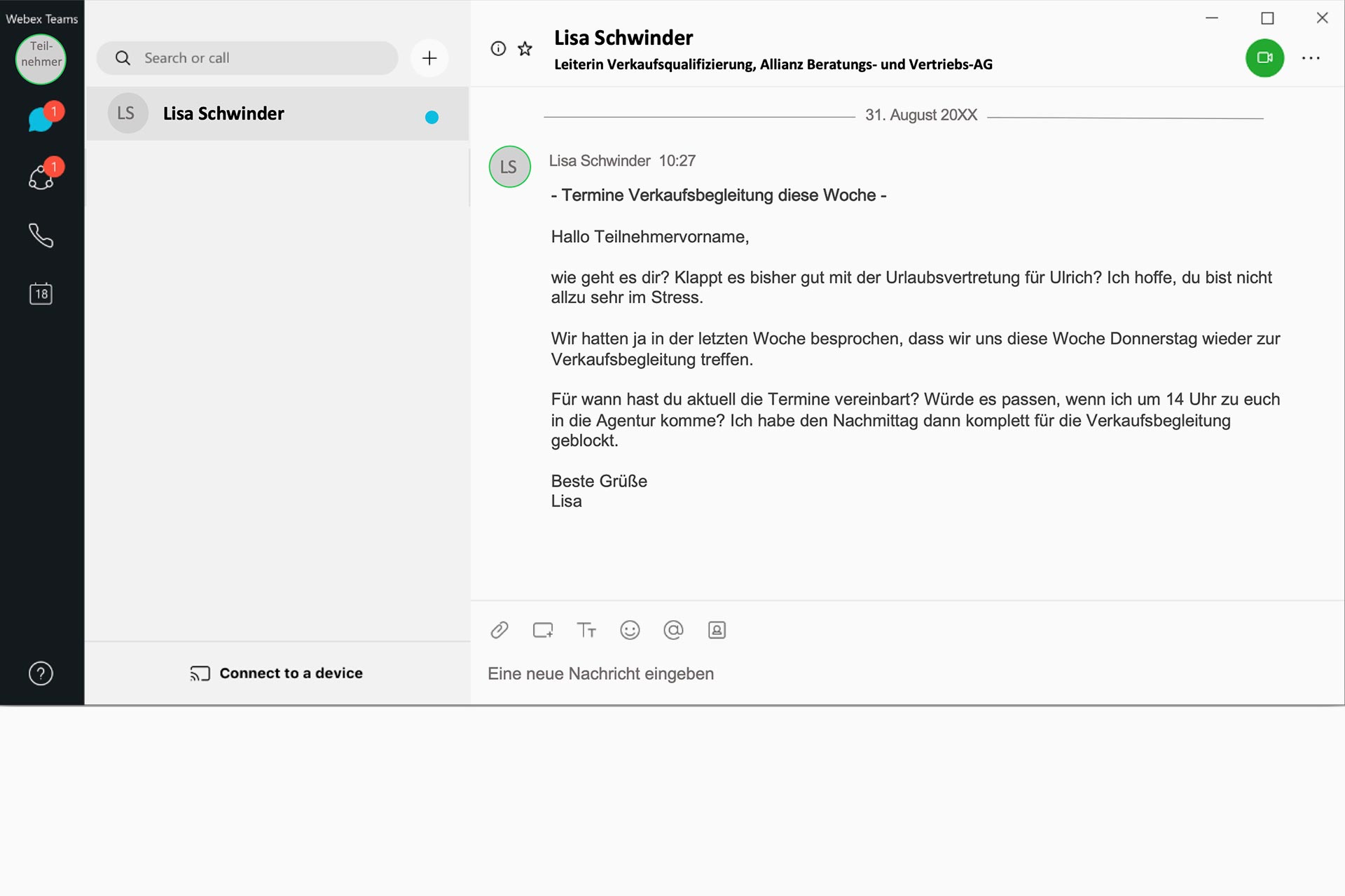 Nachfolgend eine Teams-Nachricht von Frau Schwinder (Leiterin Verkaufsqualifizierung Allianz) bzgl. der Vereinbarung von Terminen zur Verkaufsbegleitung.
