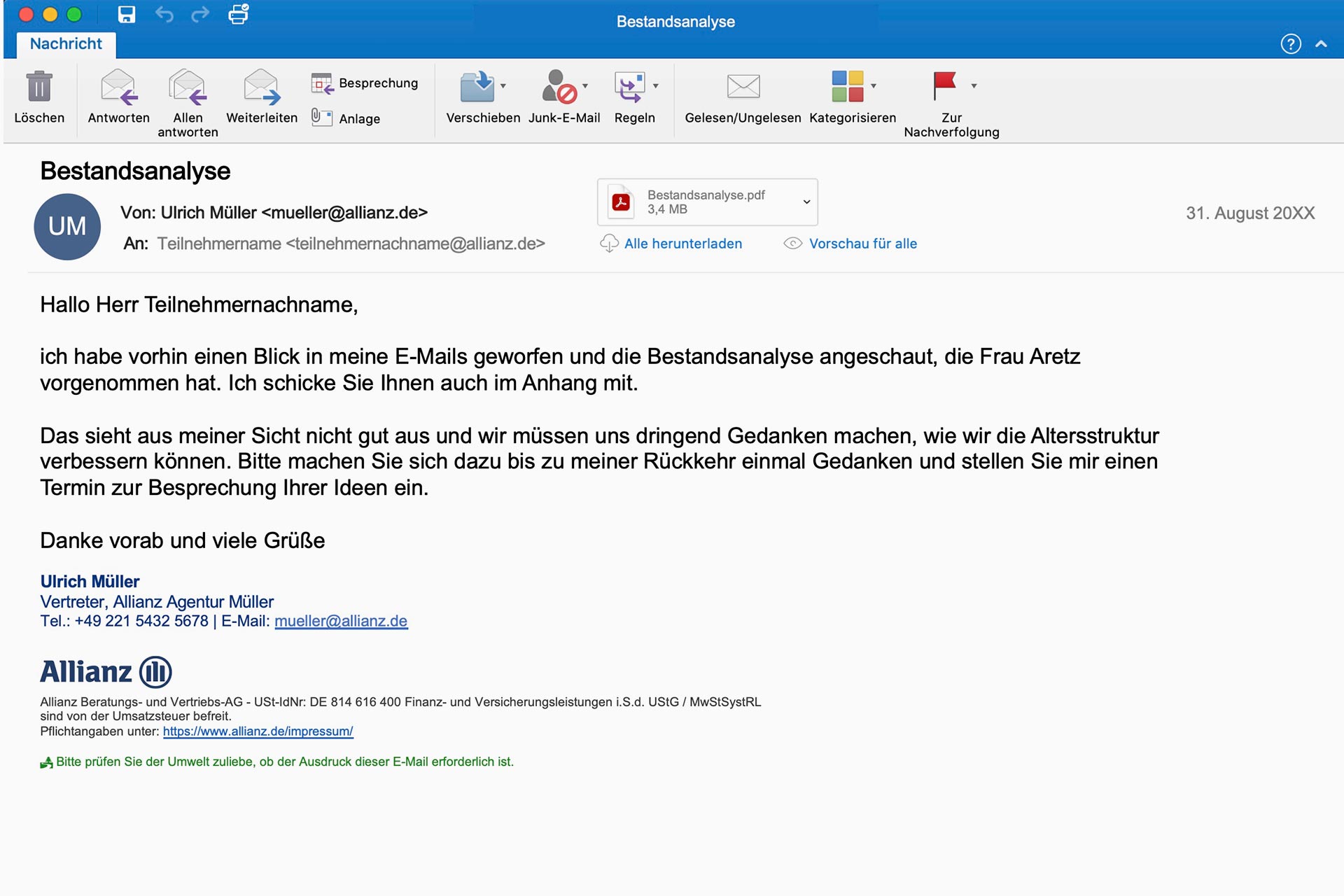 Nachfolgend leitet Ihnen Hr. Müller (Vertreter Allianz Agentur Müller) eine E-Mail mit Informationen zur Bestandsanalyse weiter.