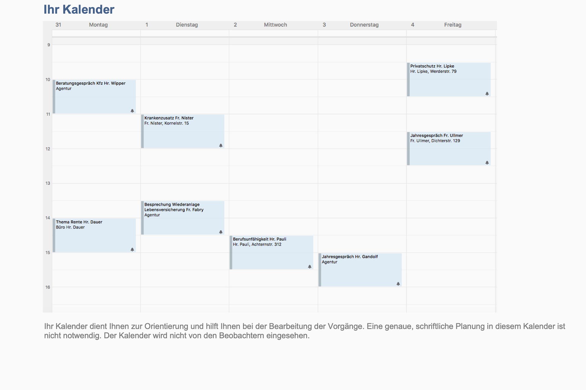 Als Kundenbetreuer ist es Ihre Aufgabe, ca. 15 Kundentermine pro Woche zu realisieren und entsprechend zu terminieren. Da Sie noch im ersten Jahr als Kundenbetreuer tätig sind, haben Sie von Zeit zu Zeit Verkaufsbegleitungstermine mit dem Leiter Verkaufsqualifizierung. Eine Verkaufsbegleitung umfasst immer drei Kundentermine, bei denen der Leiter Verkaufsqualifizierung Sie begleitet und Ihnen im Anschluss daran wertvolles Feedback gibt.
